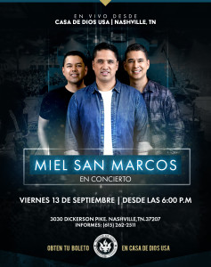 En vivo desde Nashville, TN. No te pierdas el concierto con Miel San Marcos el dia 13 de septiembre. Desde las 6:00 de la tarde. Obtén tus Boletos llamando al (615) 262-2511 o acercate a nuestras oficinas al 3030 Dickerson Pike, Nashville, TN. 37207.